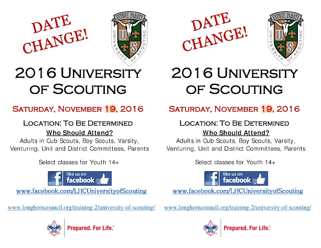 Please share the attached flyer with everyone in your unit and district with the new date for University of Scouting; November 19, 2016!